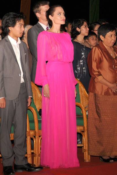 No es la primera vez que Schiaparelli diseña un vestido de estas características (tanto en color como silueta recuerda a uno que Angelina Jolie lució hace unos meses), pero los detalles de tablas, el bordado del costado en forma de candado y, sobre todo, la explosión de vida y color que supone el rosa insignia de la firma suponen un soplo de aire fresco en la alfombra roja.